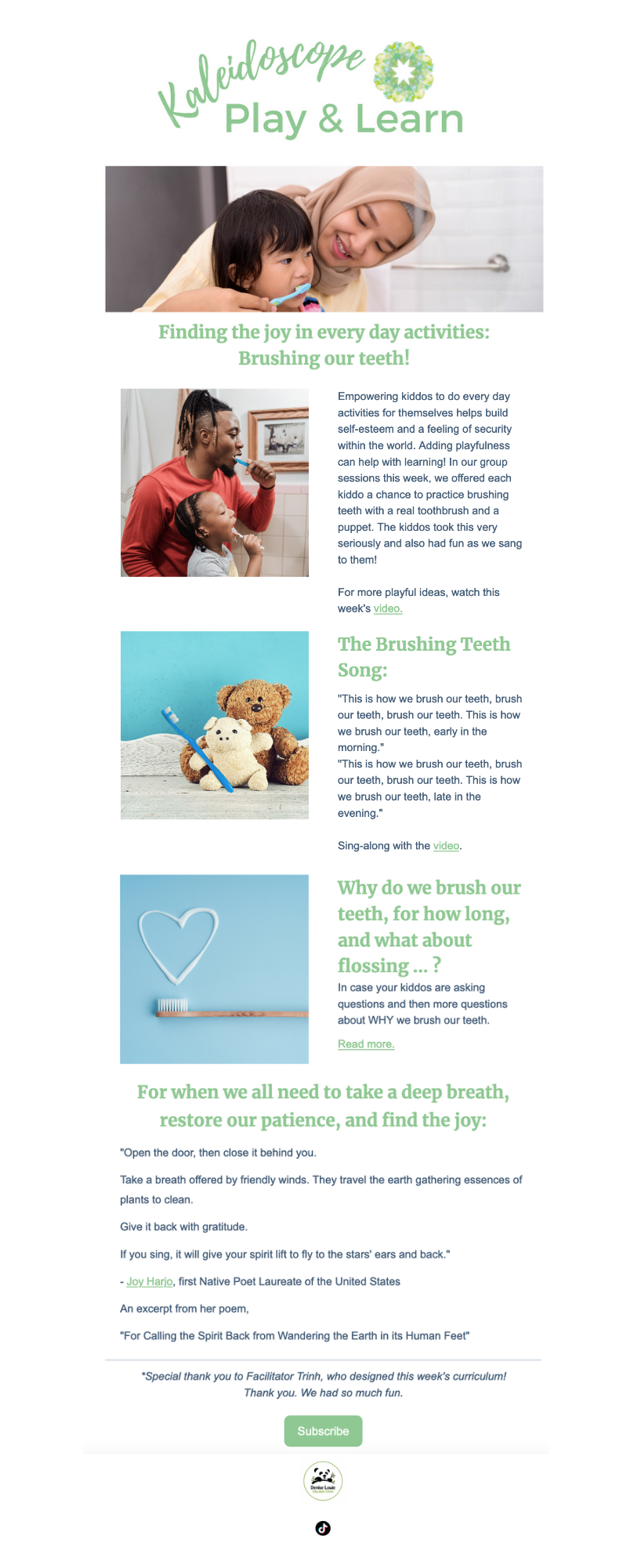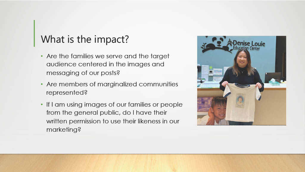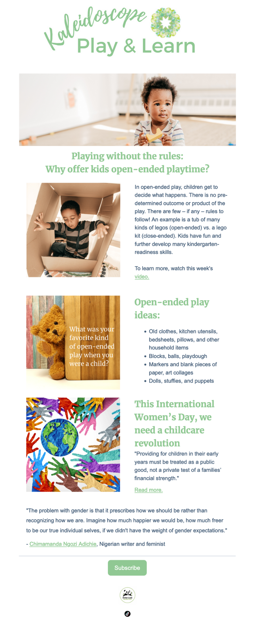 To connect in new ways with caregivers for our Kaleidoscope Play & Learn program, I decided to explore TikTok. Taking inspiration from Dr. Becky Kennedy, I share our caregiver tips and information on child development in brief one-minute videos, and then link to these videos within our weekly enewsletter.