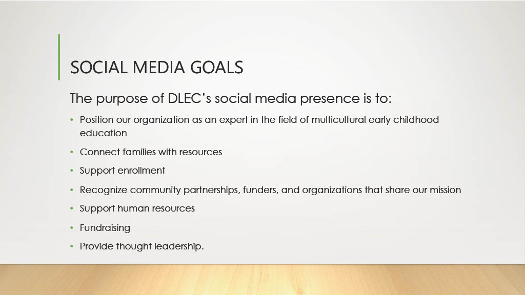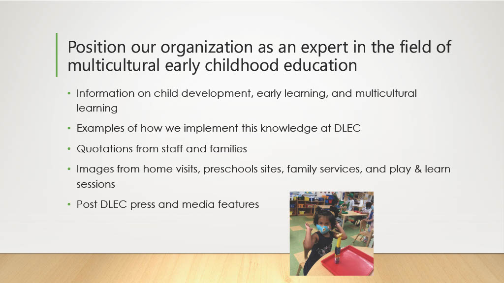 Goals included positioning our organization as an expert in the field of multicultural early childhood education, connecting families with resources, providing thought leadership, and recognizing community partnerships, funders, and organizations that shared our mission.